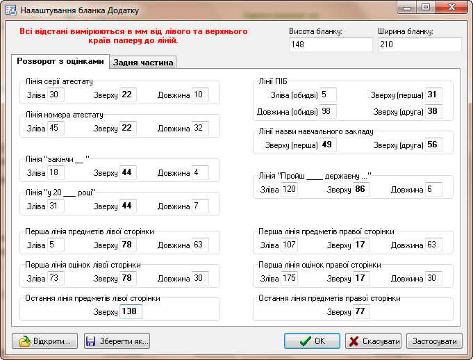 В незареєстрованій версії після нового запуску програми автоматично встановлюються налаштування за замовчуванням! Тому, якщо після підгонки макету Ви закривали програму, перед роздрукуванням не забудьте завантажити Ваші налаштування кнопкою "Відкрити..." у цьому ж вікні!
