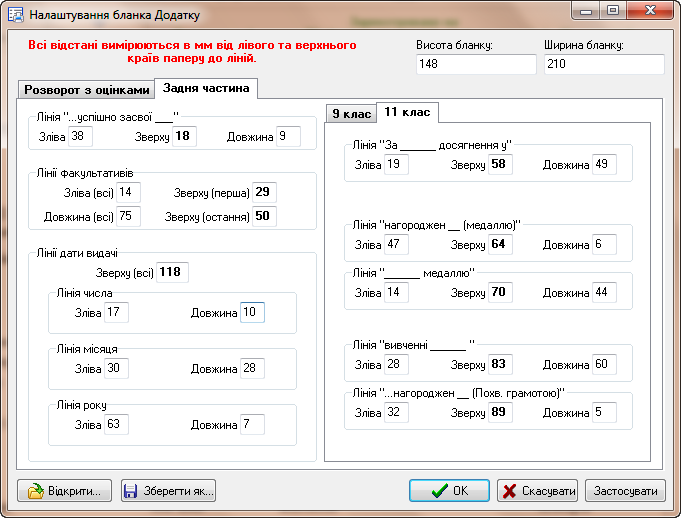 У цьому вікні присутні дві вкладки: "Розворот з оцінками" та "Задня сторінка". Оскільки макет задньої сторінки відрізняється для 9-го та 11-го класів, вони налаштовуються окремо (теж на відповідних вкладках).