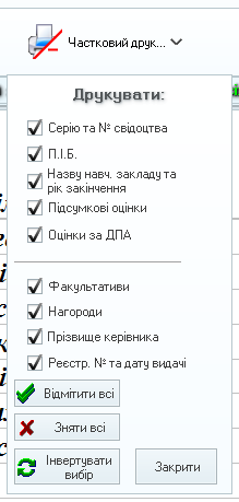 Починаючи з версії 10.0 з'явилася можливість часткового друку. Тобто якусь частину інформації можна додрукувати окремо пізніше. Для цього слід натиснути кнопку "Частковий друк" та зняти або виставити потрібні прапорці: