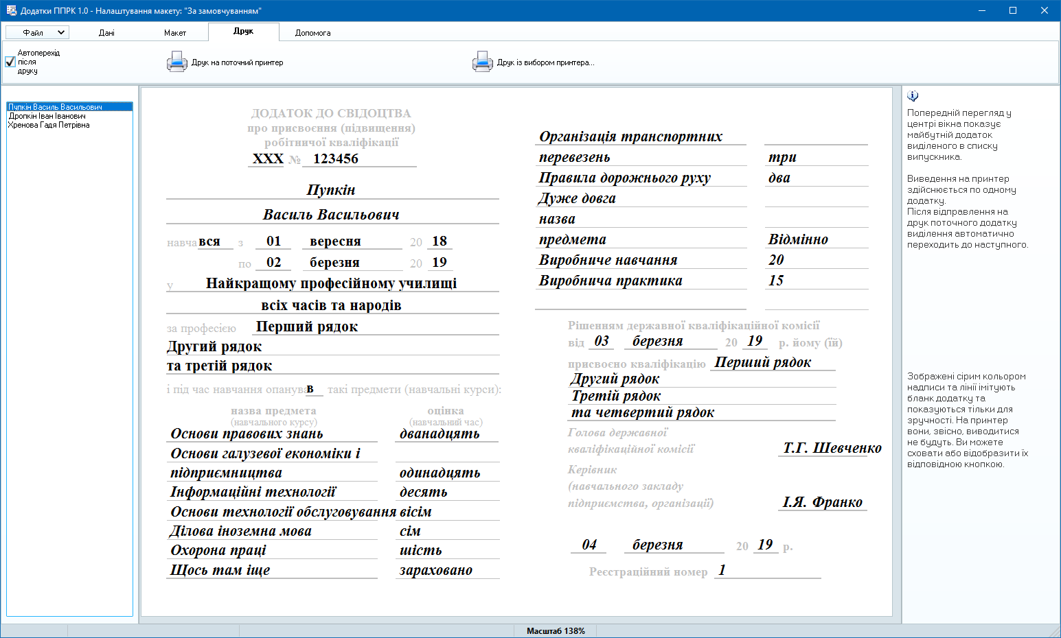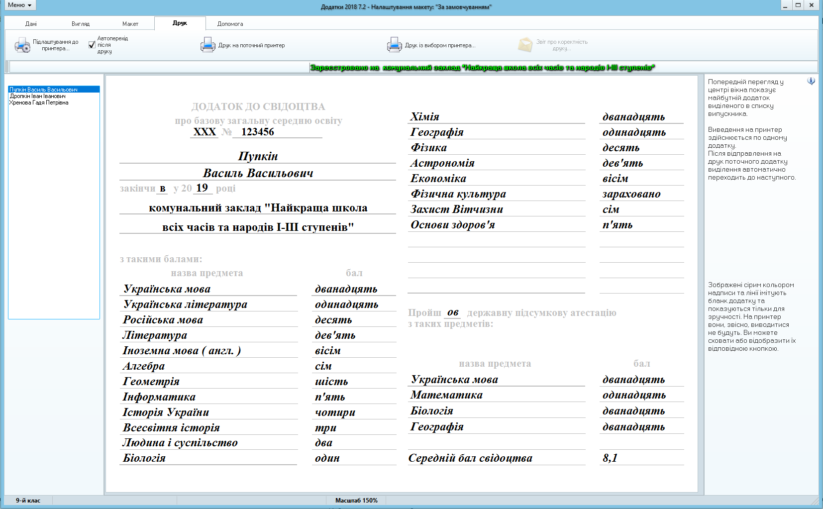 Загальний вигляд головного вікна програми Додатки 2018 після імпорту оціночної відомості (розворот з оцінками):