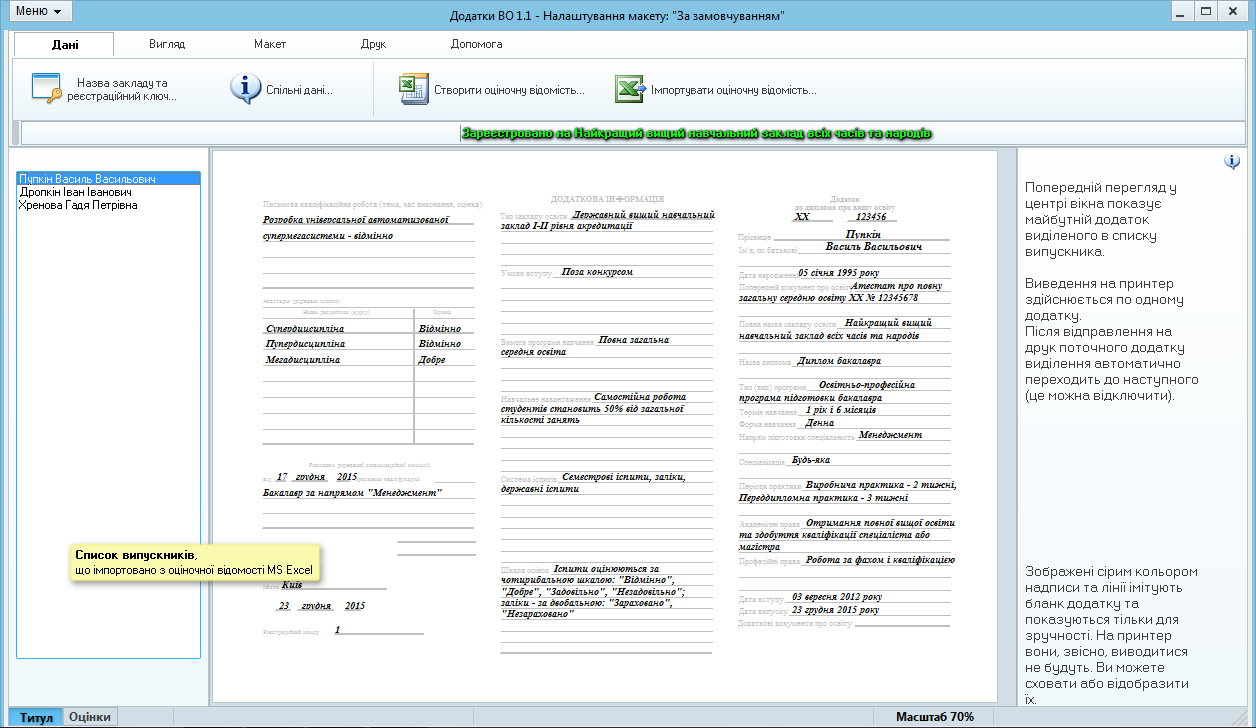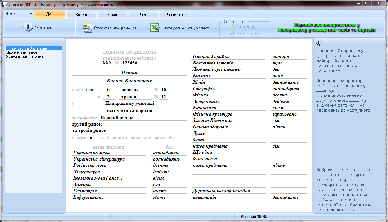 Загальний вигляд головного вікна програми Додатки ДКР після імпорту оціночної відомості (розворот з оцінками):